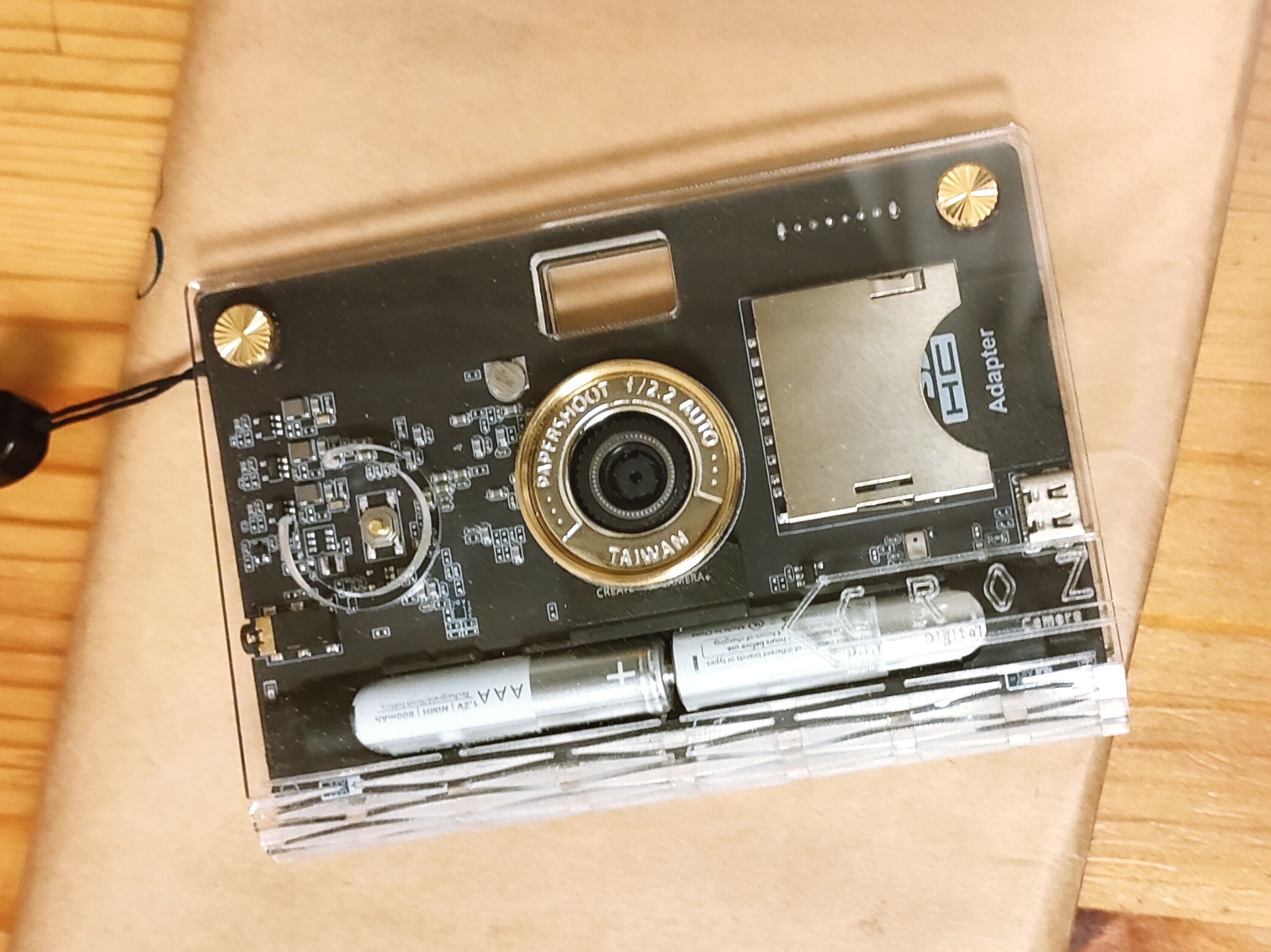 カメラ本体は1枚の基盤だけだ。シャッターボタンとモード切り替えスイッチだけがついている。モード切り替えでは「カラー/モノクロ/セピア/ブルー」のモードを選べる。充電時は「カラー/モノクロ/タイムラプス/10秒動画」というモードに変化する。